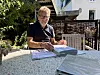 Gösta Toft blättert im Ordner, in dem historische Zeitungsartikel und Aufzeichnungen gesammelt sind.