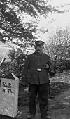 Ein deutscher Grenzwächter neben einem Grenzpfahl. Das Bild stammt womöglich aus dem Jahr 1917. Bemerkenswert ist, dass der ursprüngliche Grenzpfeiler aus Holz durch einen Pfahl aus Granit ersetzt worden ist.