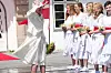 Aviaaja Marie Nedergaard (r.) und Esther Bendix Helberg Carstensen sind Mitglieder des Sankt Jørgen Pigekors und durften mit acht anderen Chormädchen sowie zwei Kindern auf dem Foto nach historischem Vorbild die Königin flankieren.