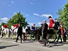Zwar nicht auf einem weißen Pferd, dafür aber in einem Kutschengespann mit vier weißen Pferden und ganz in weiß gekleidet überquerte Königin Margrethe in Begleitung von Kronprinz Frederik und Prinz Christian am Sonntagmorgen um kurz nach 10 Uhr die ehemalige deutsch-dänische Grenze bei Christiansfeld.