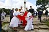 Hier erhält König Christian den Dannebrog überreicht. Eine Szene vom 11. Juli 1920 auf den Düppeler Schanzen, nachgespielt am 11. Juli 2020 mit Schauspielern von „Det lille Teater“ aus Gravenstein.
