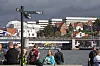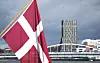 Der Dannebrog ziert den Sonderburger Hafen. Im Hintergrund die Teilnehmer der One-Mile-Strecke auf der Klappbrücke.