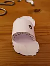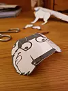 Als nächstes bastelst du Nordis Kopf. Falte das Papier, wie oben auf dem Bild zu sehen. Schneide dann einen Schlitz für die Ohren entlang der weißen Striche (über den Augen).