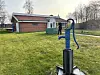 Techniker steht neben geöffneter Pumpenanlage auf Wiese vor kleinem Ziegelgebäude