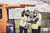 Mann in Einsatzuniform lehnt an Backsteinmauer mit Straßenschild Redningsvej.