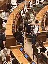 Zuerst mussten alle durch eine Sicherheitskontrolle, und nachdem sie oben im Hauptsitzungssaal ein Namensschild erhalten hatten, hieß der Venstre-Politiker Søren Gade die jungen Gäste willkommen. Dann ging es ab in die heilige Halle des Folketingssaals.