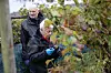 Die Weinbeeren werden auf dem Feld zunächst in Eimern gesammelt und dann zum Anhänger gebracht.