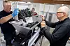 Frede Thaysen (links) und Christian Damm beim Pressen der Weinbeeren.