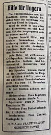 „Die Tageszeitungen und der Rundfunk geben täglich Berichte über die furchtbare Not und das Elend in Ungarn. Wird da nicht in uns allen die Erinnerung an viel Leid und Not der vergangenen Jahre wieder wach? Ungarn braucht Hilfe. Jede Gabe ist willkommen. Geldspenden, Kleidung (gute gebrauchte Sachen) und Lebensmittel (Konserven und Hülsenfrüchte).“