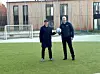 Schulleiter Carsten Uggerholt Eriksen (r.) übergibt den Ball an den künftigen Akademietrainer Morten Beck (l.).