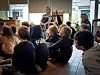 Doch zunächst geht es an die grobe Struktur einer Geschichte, die Hainer spielerisch anhand des Beispiels des „Suppe Kochens“ mit den Mädchen und Jungen bespricht: „So wie ihr alle Lieblingszutaten für eure Suppen habt, braucht auch eine Geschichte Zutaten, um spannend zu sein“, erklärt er. Und so werden aus Karotten, Chili und Gurken; grimmige Piraten, nette Papageien und große Drachen.