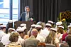 Mit seiner Ansprache beginnt die Abschlussfeier des diesjährigen Abiturjahrgangs in der Aula des Minderheitengymnasiums.