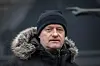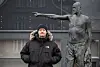 Claus Carstensen neben seiner Skulptur „Pegeren", der Zeiger. Das Selbstporträt in Bronze steht vor dem Sonderburger Gymnasium – dort war Carstensen früher Schüler.