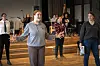 In der Aula des Deutschen Gymnasiums für Nordschleswig (DGN) herrscht ein ziemliches Gewusel. Eine Schülerin läuft mit ihrem Manuskript in der Hand auf und ab und lernt dabei ihren Text auswendig. Auf der anderen Seite des Raumes beratschlagt sich eine kleine Gruppe darüber, welche Brillen sie am besten für die Kostüme besorgen soll. Während die Band sich einspielt, tanzen sich zwei Schülerinnen warm. Insgesamt sind elf Schauspielerinnen und Schauspieler, fünf Musikerinnen und Musiker sowie drei Jugendliche für die Technik, Kostüme und Bühnenbild an dem diesjährigen Theaterprojekt beteiligt.