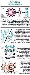 Am Anfang des Produktionsprozesses steht die Herstellung der mRNA - m steht für Messenger, auf Deutsch: Bote, aus diesem Grund spricht man auch von Boten-RNA. Die Ribonukleinsäure (RNA) ähnelt vom Aufbau zwar der DNA, hat aber nur einen Strang. Die mRNA enthält eine Art Bauplan für ein Oberflächen-Protein des Coronavirus Sars-CoV-2, das Spike-Protein. Nach einer Impfung soll der Körper so das ungefährliche Teilstück des Virus bilden, um die Immunabwehr des Menschen auszulösen. Und so wird die mRNA hergestellt:
