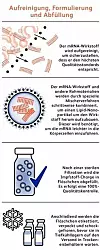Nach der Vermehrung der Bakterien werden die Zellen zerstört. Es bleibt eine „Bakteriensuppe“ im „Kochtopf“: ein Gemisch aus Zellresten und Plasmid-DNA, das in diversen Reinigungsschritten getrennt wird. Die Plasmid-DNA dient nun als Vorlage für die mRNA. Vorbereitet wird die Herstellung, indem die DNA-Doppelhelix entrollt und zum Einzelstrang geöffnet wird. Letzterer stellt dann mit Hilfe des Enzyms RNA-Polymerase die mRNA her.