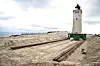 Der Leuchtturm „Rubjerg Knude Fyr“ zog mithilfe von „Rollschuhen" und Metallschienen um. Das Foto wurde aufgenommen, als etwa die Hälfte des Weges geschafft war. Das 23 Meter hohe und 120 Jahre alte Seezeichen hatte bereits nach 4,5 Stunden die gewünschten 70 Meter zurückgelegt.
