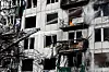 Feuerwehrleute löschen einen Brand in Tschuhujiw/Ostukraine, der nach Beschuss am 24. Februar 2022 ausgebrochen ist.