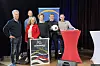 Frank Nickelsen und Ilse Johanna Christiansen vom Friesenrat, Projektleiter Ruwen Möller, FUEN-Generalsekretärin Éva Adél Pénzes, FUEN-Vize-Präsident Gösta Toft und Abteilungsleiter des Deutschen Jugendverbandes für Nordschleswig, Thore Naujeck, bei der Pressekonferenz am Dienstag im Flensborghus.