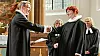 Dompropst Johannes Gregers Jensen überreicht Christiane Stahlmann das Einführungsdokument. Die Oberkirchenrätin der Evangelischen Kirche in Deutschland, Stefanie Reuther (Bildmitte), hat ein entsprechendes Dokument überreicht.