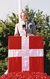 Hans Heinrich Hansen – hier als Redner zur Feier der 75-jährigen Zugehörigkeit Nordschleswigs zu Dänemark auf Düppel (Dybbøl) 1995 – ist ehemaliger Hauptvorsitzender des Bundes Deutscher Nordschleswiger (BDN) und Ehrenpräsident der Föderalistischen Union Europäischer Nationalitäten (FUEN).