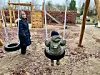 Kindergarten-Mitarbeiterin Alaa Shafi mit einem Schützling auf der neuen Schaukel