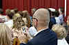 Britta Schneiders von der Deutschen Selbsthilfe Nordschleswig kommt mit einem Stapel Zettel auf die Bühne der Turnhalle, die den Rahmen bildet um die Abschlussfeier der 9. Klasse: Sie rührt die Werbetrommel für die Vereinsmitgliedschaft – und hat auch einen „Geldregen“ für Isabell dabei.