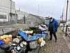 Nis-Edwin List-Petersen vor einem Haufen Zeug, das sie vom Schiff an den Kai geräumt haben.