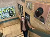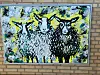 Künstlerin Gerda Nehls neben ihren Kunstwerken, einer Katze aus Fresko-Kunst und einem Gemälde von Hahn und Huhn
