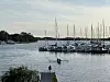 Nach der letzten Etappe versammelten sich alle Beteiligten auf der Bootsbrücke, um gemeinsam den Tag ausklingen zu lassen, und auch der traditionelle „Brückenschnaps“ durfte nicht fehlen. Beim Pizzaessen im Bootshaus klang der Tag der Inselumrundung aus.