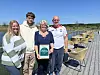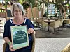 Petra Zehner mit der Willkommensplakette, die sie als ersten Gast des Nordborg Resorts auszeichnet.
