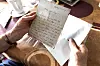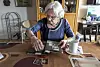 Ingrid Larsen mit einem Fotoalbum voller Bilder. Vor ihr liegen die Porträts ihrer Eltern Käthe und Otto Möller.