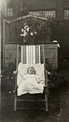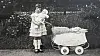 Ingrid Larsen im Kinderwagen. Im Hintergrund ist die Fabrik Krönert ihres Vaters zu sehen. Als das Zuhause der Familie Möller brannte, verschwanden auch alle Fotos. Die Familie hat nur Fotos, die ihnen andere Familienmitglieder geschenkt haben.