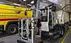Das Enteisungsfahrzeug wird mit Strom betrieben, daneben steht ein Einsatzfahrzeug der Feuerwehrbereitschaft.