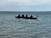 Dort nutzten sie die Gelegenheit für eine ausgedehnte Pause und stärkten sich mit mitgebrachten Broten. Für die Hinfahrt saßen Kersten Kohrs, Natascha Fieting, Ingrid Anja und Chris Eisenkrämer im Boot, während Uwe und Helene Iwersen mit dem Auto an den Zielstrand fuhren. Nach der Pause wechselten die Besatzungen: Uwe und Helene übernahmen das Ruder, während Ingrid und Chris mit dem Auto zum Club zurückkehrten.