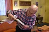 Eckart Laubinger studiert ein altes Foto eines dänischen Artikels, in dem die Flüchtlingswelle von Ostpreußen beschrieben wird.