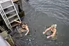 Dass die beiden Frauen ihre Köpfe nicht ins Wasser tauchen, ist absichtlich. „Dann wird es noch kälter“, so Mette Juhl Petersen, die frühere Lehrerin an der Humlehøjskole in Sonderburg. Heute pflegt sie den Küchengarten des Ziegeleimuseums Cathrinesminde und sie wirkt mit bei den Aktivitäten von „Die lebendige Ziegelei“. Im Sommer kommen viele Touristinnen und Touristen nach Brunsnis, um sich auf dem früheren Ziegeleigelände am Strand abzukühlen.