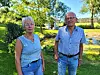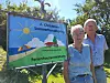 Anna und Walter Christensen neben dem Schild ihrer Ferienhausvermietung, das einst schon Walters Eltern entwerfen ließen. Seitdem ist es grafisch etwas modernisiert worden.