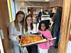 Ebba, Maria und Dhayahnj mit einem Blech selbstgebackener Pizza, die sie am Schulhof verkauften.