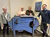 Die Familie Holm mit Else, Vivi, Hans Senior und Hans Junior an einer alten Reinigungsmaschine für Korn, die aus den Anfängen der im Jahre 1900 gegründeten Handelsfirma stammt. Else ist die Oma des heutigen Juniorchefs.
