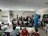 Die Jugendlichen, die sich für diesen Tag ein besonderes Outfit übergestreift hatten, starteten mit einem gemeinsamen Frühstück in den Tag. Danach zogen sie mit einem Bollerwagen, der unter anderem mit Karamellbonbons bestückt war, durch die Klassen.