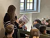 Schülerin Annie Rost liest eine Schlagzeile aus dem Mittelalter-Kurier vor.