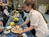 Während des Programms heißt es für die 16-Jährigen Pause machen. Jetzt haben auch sie die Möglichkeit, die von ihnen ausgeschenkte Suppe einmal zu probieren. In der Zwischenzeit müssen sie sich aber auch schon auf die folgende Kaffeetafel vorbereiten. In einer Umkleidekabine der Sporthalle stehen unzählige Kaffeekannen bereit und die Torten, die zum Deutschen Tag einfach dazugehören, sind auch schon ausgepackt.