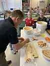 John Madsen Sommer hatte 12,5 Kilo frisch gerührten Teig in der passenden Konsistenz mitgebracht. Er und Frau Lea hatten außerdem frisch geschälte Apfelstücke, Nusssplitter und verschiedene Schokoladen-Dekos, die rund waren oder die Form eines Kürbisses oder einer Fledermaus hatten.