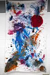 Mitschülerin Malou Veng Engel hat den Künstler Jackson Pollok als Vorbild für ihr Werk gewählt und sich von ihm inspirieren lassen. „Alles ist zufällig entstanden“, erklärt Anne Lildholdt Jensen stellvertretend für ihren Schützling, der beim Besuch des „Nordschleswigers“ nicht anwesend war. „Malou hat den unbewussten, zufälligen Zugang zum Thema gewählt. Sie hat mit ihrem ganzen Körper gemalt, ist über die Leinwand gerollt, hat mit Händen und Füßen darüber gewischt“, erklärt die Lehrerin, die selbst seit vielen Jahren Künstlerin ist und sich über die Apenrader Kommunegrenze hinweg einen Namen gemacht hat.