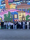 Jugendliche der Nachschule vor einer bemalten Fassadein Berlin