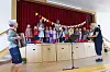 Einige Vorschülerinnen gesellten sich zum Mitsingen zu den Kindergartenkindern. Renate Osterholz (Akkordeon) und der stellvertretende Abteilungsleiter Lars Malligsen-Schorr (Gitarre) unterstützten die Sängerinnen und Sänger.