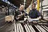 Christian Petersen mit einem Mitarbeiter in der Produktionshalle, wo die fertigen Ziegel verlesen und gestapelt werden.