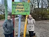 Heidi Jessen und Kerstin Hinrichsen vor dem Schulschild an der Straße. Sie hoffen, dass das Schild auch künftig auf eine Schule in Betrieb hinweist.