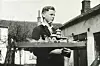 Schüler vermutlich mit einer Nachbildung des Schlachtschiffs „Gneisenau“ der deutschen Kriegsmarine